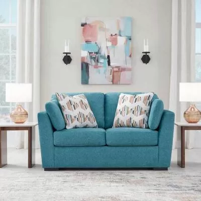 This vibrant blue sofa effortlessly enhances the ambiance of a room when styled against white walls. Pair it with embroidered cushions for added texture and elegance, while a statement wall art piece can tie the entire space together. Whether you're hosting guests or enjoying a quiet evening, the Keerwick Sofa adds a touch of sophistication and character to your home, making it the perfect centerpiece for modern living rooms.