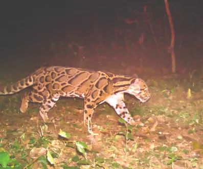 The clouded leopard (Neofelis nebulosa) is a nocturnal inhabitant of dense forests in Northeast India, Bhutan, Nepal, and parts of Southeast Asia. Named for its cloud-like coat patterns, it is an agile climber that spends most of its time in trees. Experts say images of this species are extremely rare, as it rarely comes to the ground, especially during daylight.